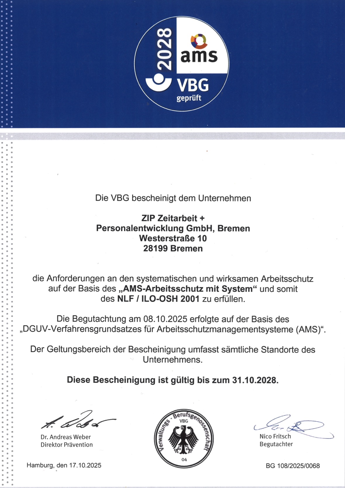 Wir wissen, dass unser Erfolg auf gesunden leistungsstarken Mitarbeitern beruht. Deshalb haben wir unseren Arbeits- und Gesundheitsschutz systematisch verbessert und sind nach den Normen des Qualitätsmanagementsystems AMS der VBG zertifiziert. Die Optimierung unseres Arbeits- und Gesundheitsschutzes innerhalb dieses Systems bleibt weiterhin ständige Aufgabe.
